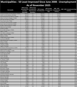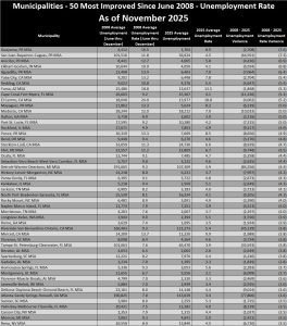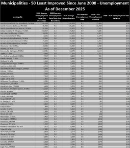 353 of the 388 municipalities (91.0%) have an average monthly number of unemployed lower in 2025 than 2008. (November 2025)