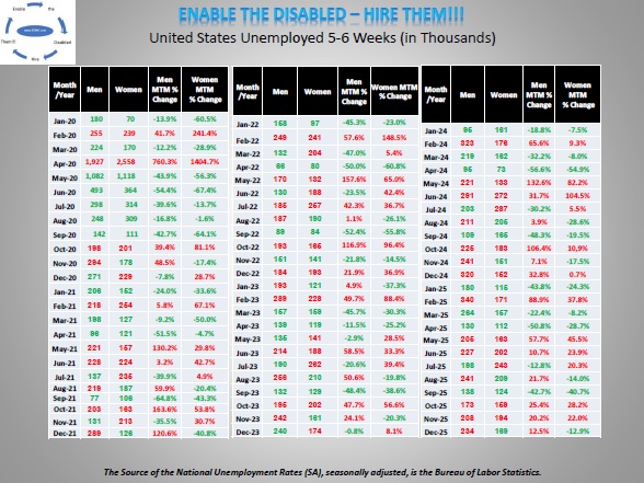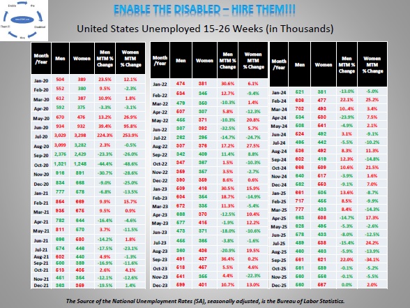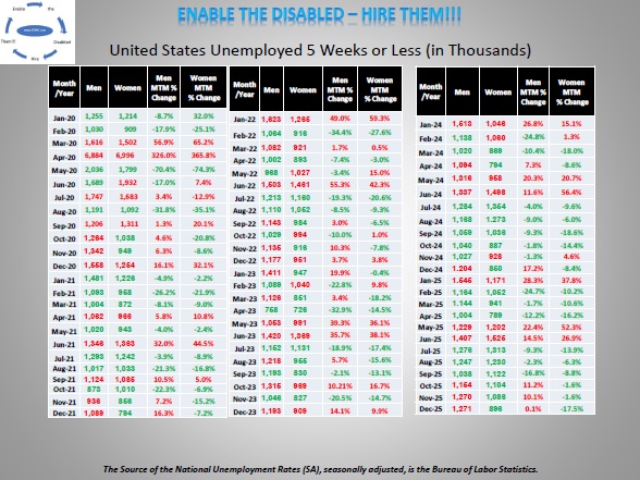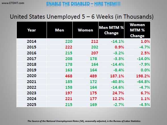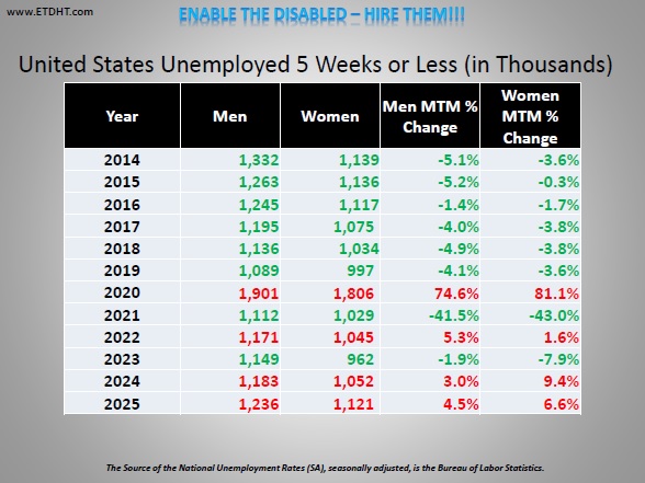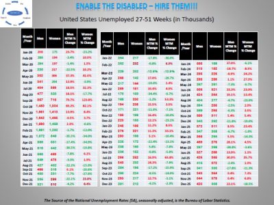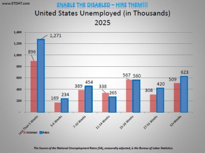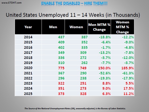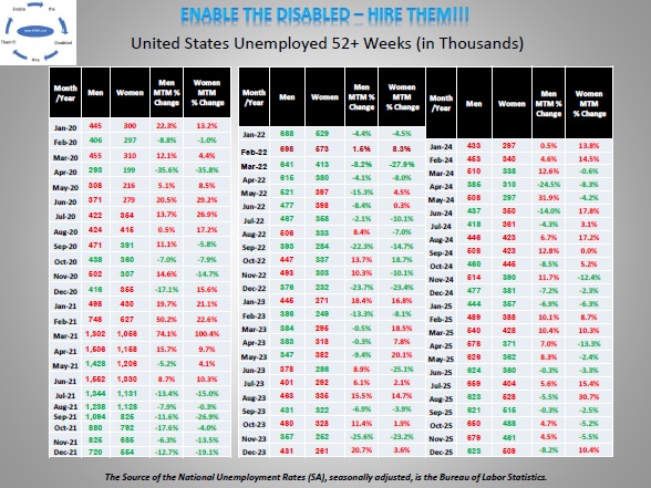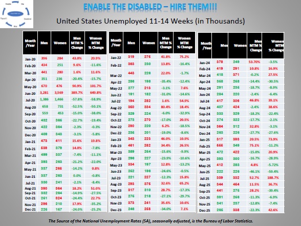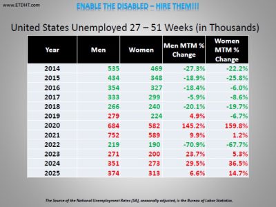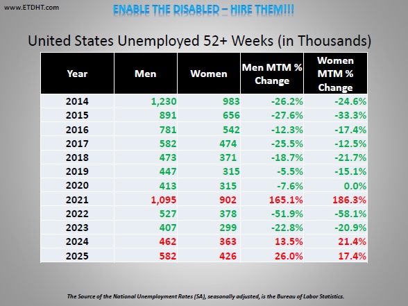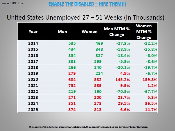 The percentage and number of those unemployed over 52 weeks increased for the month of December 2025 increased (17.3%) 1,300,708 from November 2025 (16.2%) 1,211,845. (See Unemployed 52 Weeks or Longer)